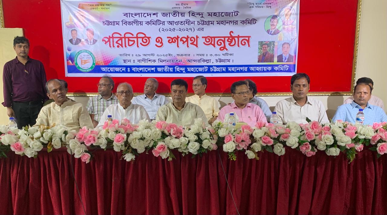 বাংলাদেশ জাতীয় হিন্দু মহাজোট চট্টগ্রাম বিভাগীয় কমিটির আওতাধীন চট্টগ্রাম মহানগরের নবনির্বাচিত কমিটি ঘোষণা,পরিচিতি ও শপথ গ্রহণ অনুষ্ঠান বাংলাদেশ জাতীয় হিন্দু মহাজোট চট্টগ্রাম বিভাগীয় কমিটির সহ সাধারণ সম্পাদক ও কমিটি গঠন কল্পে গঠিত আহবায়ক কমিটির সম্মানিত আহবায়ক দয়াল কান্তি সামন্ত এর সভাপতিত্বে ২৯ আগস্ট ২০২৫ শুক্রবার বিকাল ৩.৩০ ঘটিকায় চট্টগ্রাম আন্দরকিল্লাস্থ বাগীশিক মিলনায়তনে অনুষ্টিত হয়।সমবেত কন্ঠে শ্রীমদ্ভগবদগীতা পাঠের মাধ্যমে অপূর্ব ধর এর সঞ্চালনায় শুরু হয়।এতে প্রধান অতিথি ছিলেন বাংলাদেশ জাতীয় হিন্দু মহাজোট চট্টগ্রাম বিভাগীয় কমিটির সভাপতি প্রকৌ. নীপেশ রঞ্জন হোড়। বিশেষ অতিথি ছিলেন নির্বাহী সভাপতি শ্রী হরিনারায়ণ ভট্টাচার্য্য, সাধারণ সম্পাদক শ্রী কৃষ্ণপদ আচার্য্য,সহ সাধারণ সম্পাদক বিমল কান্তি নাথ,দপ্তর সম্পাদক সুজিত দাশ,অর্থ সম্পাদক বনবিহারী আচার্য্য,সহ সাংগঠনিক সম্পাদক শিমুল কুমার নাথ,সহ ধর্ম ও সাংস্কৃতিক বিষয়ক সম্পাদক সঞ্জয় আচার্য্য,চট্টগ্রাম দক্ষিণ জেলার সভাপতি মৃদুল কান্তি বৈদ্য।বাংলাদেশে সংখ্যালঘুদের উপর যে চলমান পরিস্থিতি শুরু হয়েছে তার থেকে মুক্তির একমাত্র পথ পৃথক নির্বাচন ব্যবস্থা। এটা এখন সনাতনীদের একমাত্র মুক্তির সনদ।এজন্য সকল সনাতনীদের ঐক্যবদ্ধ আন্দোলন গড়ে তুলতে হবে।আগামীতে কেন্দ্রীয় মহাসচিব এড.গোবিন্দ চন্দ্র প্রমানিক হিন্দুদের দাবী আদায়ে যে মহাসমাবেশের ডাক দিবে তা সফল করার জন্য বাংলাদেশ জাতীয় হিন্দু মহাজোটের সর্বস্তরের নেতা কর্মীদের তৃণমূল পর্যায়ের হিন্দুদের নিয়ে দাবী আদায়ে কাজ করতে হবে। বাংলাদেশ জাতীয় হিন্দু মহাজোট চট্টগ্রাম বিভাগীয় কমিটির ভারপ্রাপ্ত সাধারণ সম্পাদক পলাশ কান্তি নাথ প্রধান বক্তার বক্তব্যে এসব কথা বলেন।প্রধান অথিতি তার বক্তব্যে বলেন নবগঠিত চট্টগ্রাম মহানগর কমিটি তাদের নিজ নিজ দায়িত্ব যথাযথ ভাবে পালন করে নির্যাতিত নিপীড়িত হিন্দুদের পাশে থেকে যেন কাজ করেন।তিনি আরো বলেন আগামী তিন মাসের মধ্যে মহানগরের সমস্ত থানা কমিটি গুলো গঠন করে সাংগঠনিক শক্তিকে মজবুত করবে।সভায় স্বাগত বক্তব্য রাখেন আহবায়ক কমিটির সদস্য সচিব শ্রী উত্তম চক্রবর্তী। আরো বক্তব্য রাখেন লায়ন সুভাষ দাশ, এড. উত্তম কুমার রায় ,উত্তম বিশাংগীরি, লিটন কান্তি শীল,বিদ্যুৎ মজুমদার ,শ্যামল বিশ্বাস প্রমুখ। সভায় শ্যামল কান্তি নাথকে সভাপতি, এডভোকেট উত্তম কুমার রায়কে সাধারণ সম্পাদক, বাবলু আচার্য্যকে অর্থ সম্পাদক ও লিটন কান্তি শীলকে সাংগঠনিক সম্পাদক করে ৫১ সদস্য বিশিষ্ট একটি পূর্ণাঙ্গ কমিটি ঘোষনা করা হয়। সভায় বক্তাগণ বাংলাদেশ জাতীয় হিন্দু মহাজোট কেন্দ্রীয় কমিটির মহাসচিব এড.গোবি