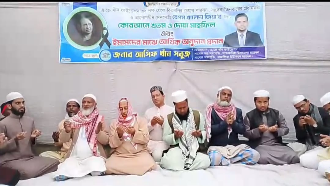 বি এন পির চেয়ারপার্সন, তিন বারের সাবেক সফল প্রধানমন্ত্রী দেশনেত্রী বেগম খালেদা জিয়ার চিরবিদায়ে শোকাহত পুরো জাতি এ শোকর্তের অংশ হিসেবে চট্টগ্রামেের সাতকানিয়া উপজেলা ছাত্রদলের সাবেক সহ সভাপতি, এ জে খাঁন ফাউন্ডেশনের চেয়্যারম্যান আসিফ খান সবুজের আয়োজনে খতমে কোরআন ও দোয়া মোনাজান অনুষ্ঠিত হয়। দোয়া মাহফিল শেষে ইমামদের মাঝে আর্থিক অনুদান প্রদান করেন।