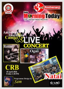 আগামী কাল Daily MORNING TODAY’র উদ্দ্যেগে তৃতীয় প্রতিষ্ঠা প্রতিষ্ঠা বার্ষিকী উৎযাপন উপলক্ষে চট্টগ্রাম রেলওয়ে সি,আর,বি মাঠে শিরিশ তলায় নতুন প্রজন্ম ও জনসাধারণ কে মাদকের ছোবল থেকে রক্ষা করা ও সচেতনতা সৃষ্টির লক্ষ্যে মাদক বিরোধী লাইভ কনসার্টের আয়োজন করা হয়েছে। উক্ত অনুষ্ঠানে সুশীল সমাজের গণ্যমান্য ব্যক্তিবর্গ ও প্রশাসনের প্রশাসনের উর্ধতন কর্মকর্তা গণ উপস্থিত থাকবেন। আমাদের সাথে রয়েছে স্বরাষ্ট্র মন্ত্রণালয়ের অধীন মাদক দ্রব্য নিয়ন্ত্রণ অধিদপ্তর চট্টগ্রাম।