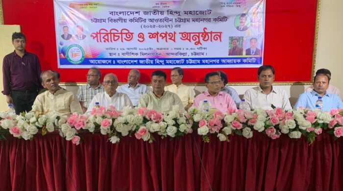 নিজস্ব প্রতিনিধি বাংলাদেশ জাতীয় হিন্দু মহাজোট চট্টগ্রাম বিভাগীয় কমিটির আওতাধীন চট্টগ্রাম মহানগরের নবনির্বাচিত কমিটি ঘোষণা,পরিচিতি ও শপথ গ্রহণ অনুষ্ঠান বাংলাদেশ জাতীয় হিন্দু মহাজোট চট্টগ্রাম বিভাগীয় কমিটির সহ সাধারণ সম্পাদক ও